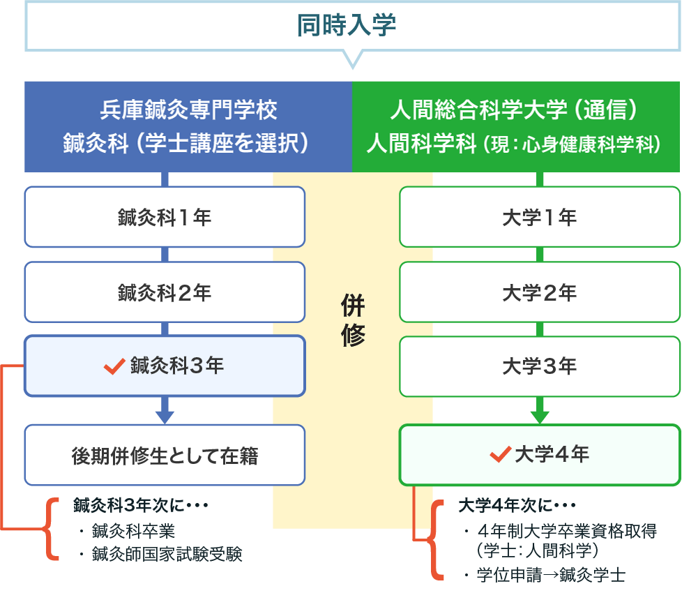 併修制度を希望の方は、入学時に兵庫鍼灸専門学校「鍼灸科(学士講座を選択)」、人間総合科学大学」「人間科学科」に同時に入学していただき、鍼灸科は3年間。人間科学科は4年間勉学に励んでいただきます。